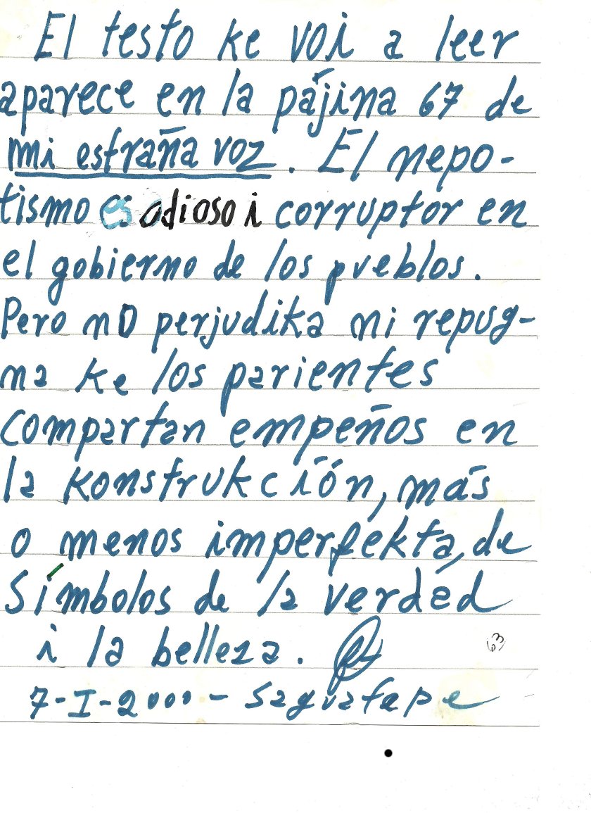 “¿No será, acaso, el miedo a la muerte miedo a la libertad? Miedo a perder lo que nos mide, lo que nos limita: el tiempo, el espacio. Miedo al silencio i a la soledad puesto que a lo largo de la vida nos negamos a la soledad i al silencio i nos dimos locamente a la palabrería i al estrópito. Miedo –dolor– de perder a los que creímos amar i no pudimos –no quisimos– incorporarlos a nosotros incorporándonos a ellos; más que por la palabra con la acción silenciosa?”