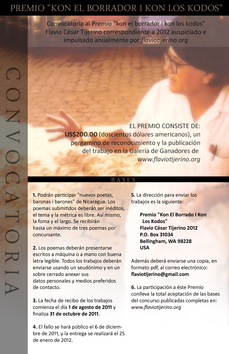 "El más calificado asesor con que cuenta el poeta cuando escribe o corrije son las mismas palabras: ellas mismas se conocen, revocan, atraen, repulsan en el testo inspirado comunicado entre sí, aunque se encuentren distantes unas a otras." P R E M I O S En homenaje a la memoria del poeta Flavio César Tijerino hemos decidido crear el siguiente premio: Premio annual "kon el borrador i con los kodos" Flavio César Tijerino, está dirigido a estimular poetas emergentes. El premio consiste de US$200.00 (doscientos dólares americanos) en efectivo, un pergamino de reconocimiento y la inclusión permanente de el trabajo en la galería de ganadores. Este premio será entregado el día 25 de enero a recomendación de una organización, colegio o asociación nicaraguense. CONVOCATORIA (apriete aquí para leer las bases completas) ![]() Galeria de Ganadores |